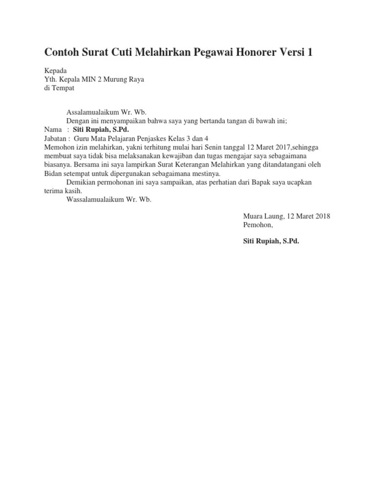 Contoh Surat Cuti Melahirkan Bagi Guru Honorer - Contoh Surat Cuti Bersalin Swasta Letter 7saudara Com / Kepala min 2 murung raya.. 25.04.2019 · contoh surat cuti melahirkan untuk guru beragam contoh surat cuti yang perlu dipahami pengelola hr peraturan cuti pns terbaru bersalin alasan penting jenis contoh surat izin cuti mengajar bagi guru terbaru homesdku contoh surat cuti melahirkan informasi seputar dunia contoh surat cuti melahirkan pegawai honorer versi 1 docx Contoh surat cuti melahirkan guru. Contoh surat cuti melahirkan pegawai honorer terkhusus buat wanita pegawai honorer … Apapun profesi anda, tetap berhak mengajukan izin cuti melahirkan. Kepala sekolah sdn 1 bogor.